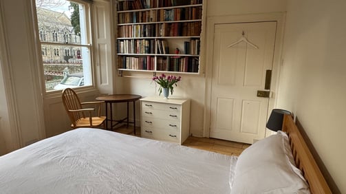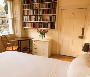The other bedroom on the first floor (Bedroom 2) has a king size bed, a rocking chair, and a lot of books to read on a relaxing afternoon.