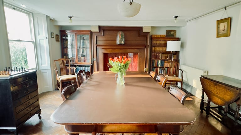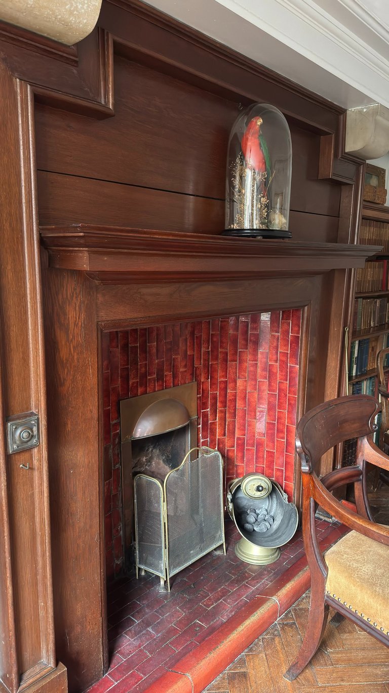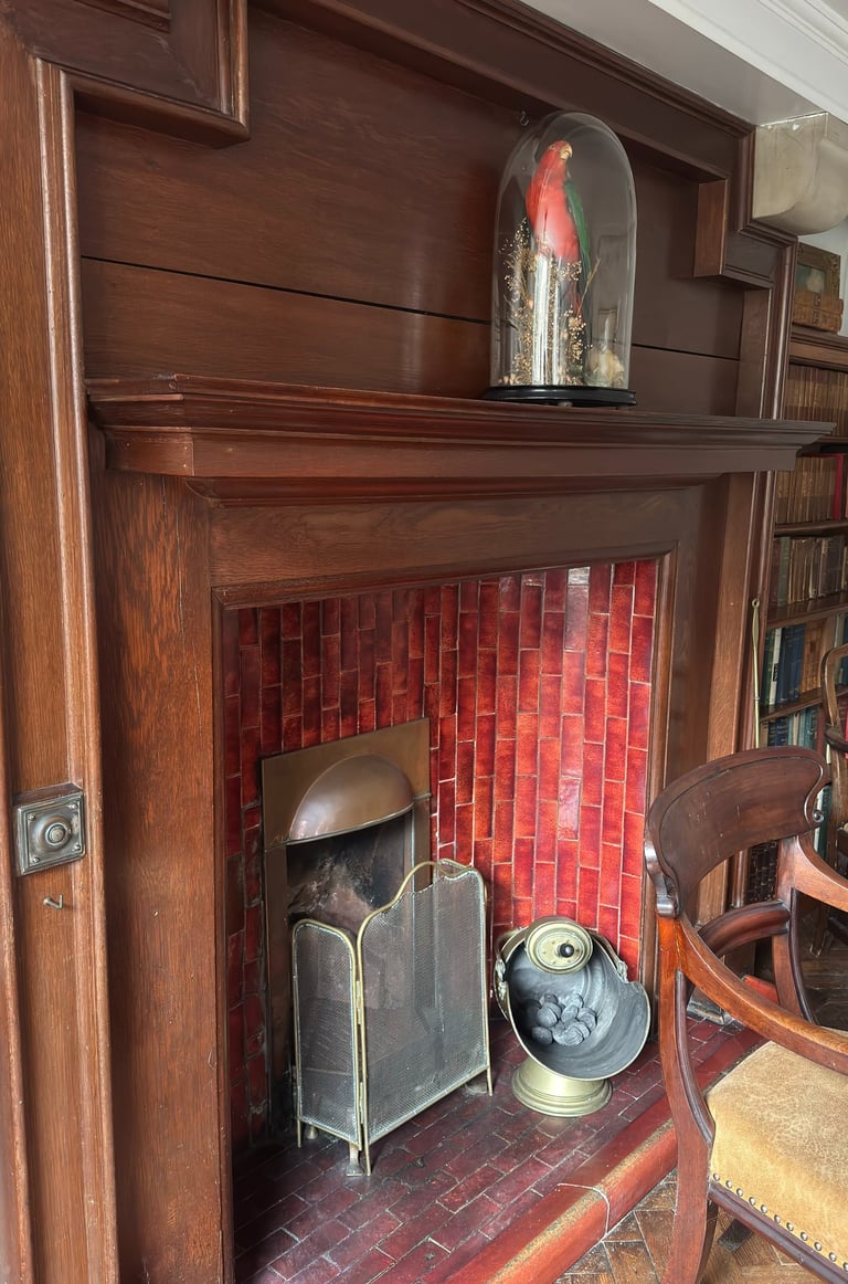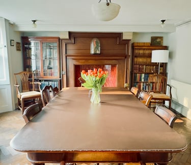 If you turn to your left from the entrance hall, you will be drawn into a fantastic mystical dining room where you will find a large table seating up to 12 people, a beautiful curved fireplace guarded by our special 120-year-old parrot, two cabinets filled with old books, and a sideboard full of games to keep you entertained.