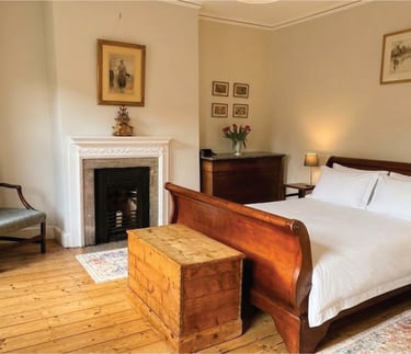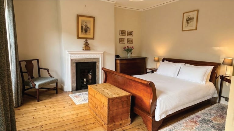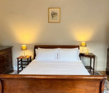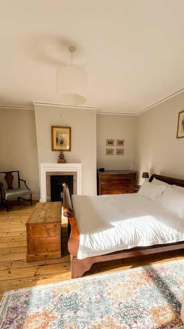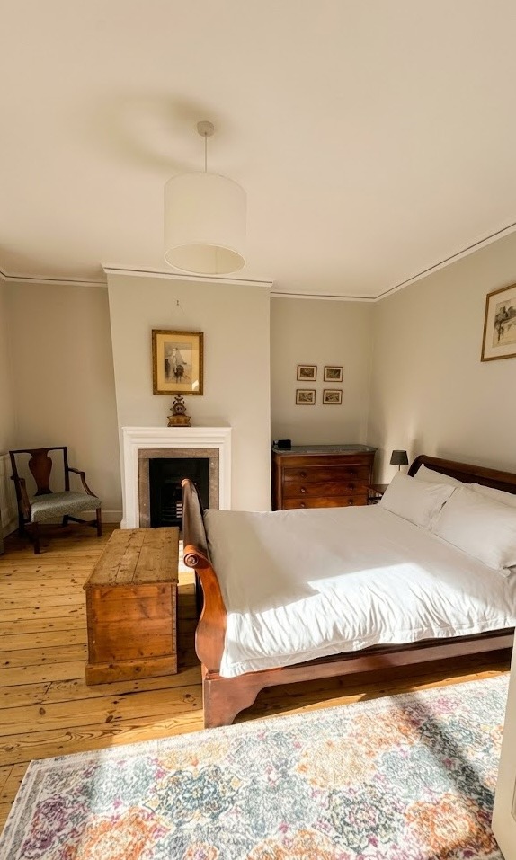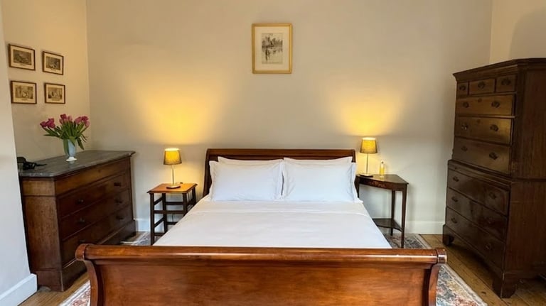 There are two bedrooms on the first floor, both facing the front of the house and taking in a lot of sun in the second half of the day. The Master Bedroom (Bedroom 1) has a beautiful and comfortable traditional king size sleigh bed, plenty of storage, and a walk-in dressing area. Optional additional travel cot is pictured below.